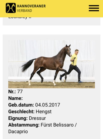 El numero 77 (FURST BELISSARO x DACAPRIO) no paso la licenciatura , pero en la posterior subasta fue el segundo precio mas alto de los sementales no licenciados, alcanzado la cifra de 40000 euro.