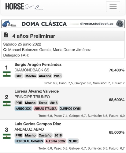 DAMION SS participo en el CDN 3*-LAS CADENAS con su jinete LUIS JAVIER CAÑADA FERNANDEZ alcanzando un tercer puesto, con una nota final de 7,340. TROTE : 7,3 / PASO : 7,7 / GALOPE : 7,4