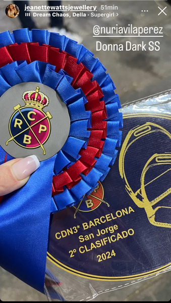 El pasado fin de semana se disputo el CDTE 1* en la HIPICA CAN VILA, esta vez montada por la amazona JEANETTE WATTS la yegua DONNA DARK SS (DREAM IN BLACK x SENIORITA) obtuvo un meritorio 2º puesto con una nota final de 65´928.