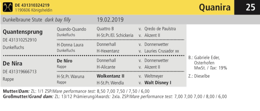 QUANIRA ( QUANTENSPRUNG x DE NIRO x WOLKENTANZ) adjudicada en 8000 euros , es hija de una hermana por parte de madre de nuestra yegua DARRYL.